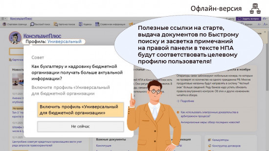 Для удобства специалистов бюджетных организаций, которые сейчас работают в универсальном профиле, в КонсультантПлюс будут появляться подсказки с предложением перейти на профиль «Универсальный для бюджетной организации», чтобы не пропустить важных нюансов именно для организаций бюджетной сферы.