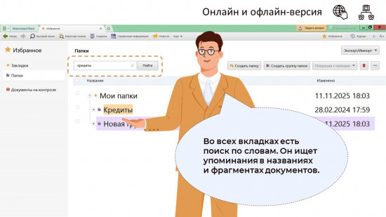 Все вкладки теперь размещены на новой левой панели: «Закладки», «Папки», «Документы на контроле» и «Запросы на контроле». Рядом с «Документами на контроле» и с «Запросами на контроле» будет появляться число документов или запросов с непросмотренными изменениями.