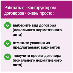 «Конструктор договоров» - инструмент для создания и проверки договоров и других документов организации. Он содержит наиболее востребованные договоры: аренды, поставки, подряда, возмездного оказания услуг, трудовой и др., а также локальные нормативные акты (всего 84 документа).