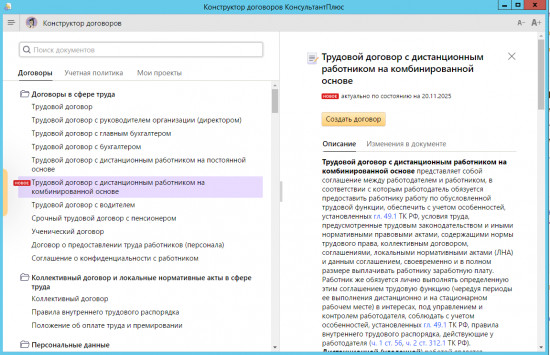 В разделе «Договоры в сфере труда» появился Трудовой договор с дистанционным работником на комбинированной основе.