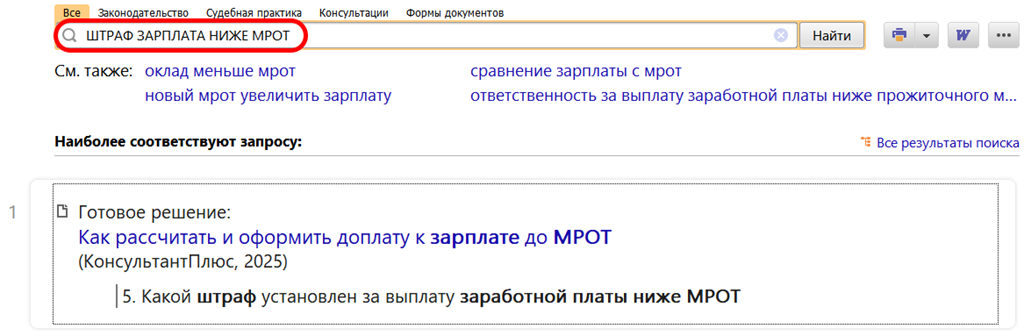 О том, какой штраф установлен за выплату заработной платы ниже МРОТ, читайте в Готовом решении: Как рассчитать и оформить доплату к зарплате до МРОТ (КонсультантПлюс, 2025)