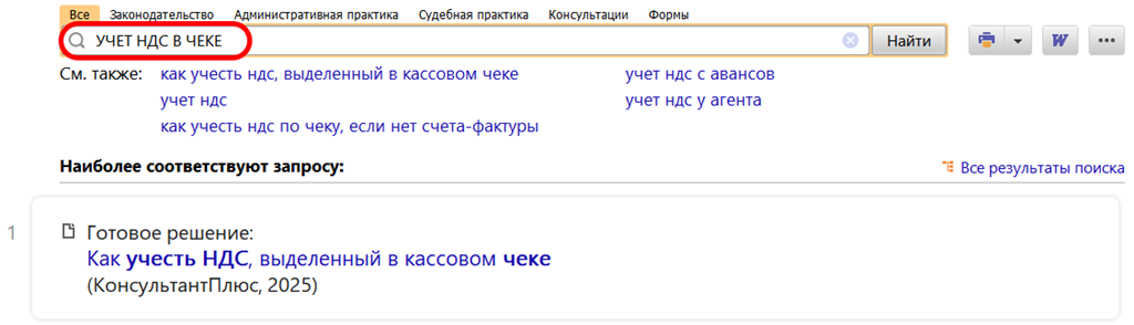 Особенности отражения в учете НДС, который выделен в кассовом чеке, см. в Готовом решении: Как учесть НДС, выделенный в кассовом чеке (КонсультантПлюс, 2025)