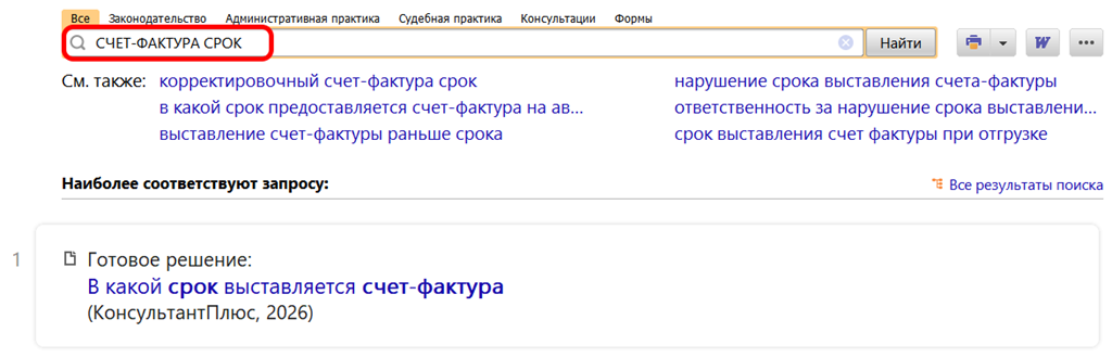 В какие сроки надо оформлять счета-фактуры, расскажет Готовое решение: В какой срок выставляется счет-фактура (КонсультантПлюс, 2026)