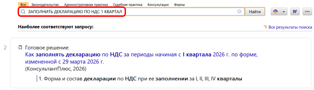 Как заполнить без ошибок новую декларацию по НДС, расскажет Готовое решение: Как заполнять декларацию по НДС за периоды начиная с I квартала 2026 г. по форме, измененной с 29 марта 2026 г. (КонсультантПлюс, 2026)